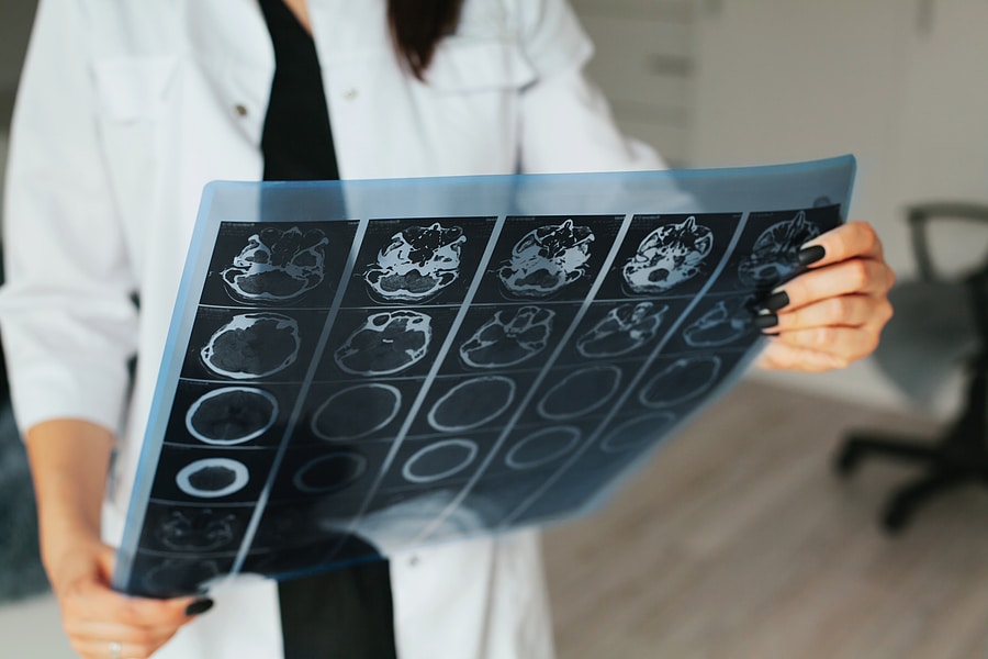 X-ray of the head in womens hands with black manicure. MRI examination of the patients head. The study of the MRI of the head by a doctor-radiologist. Head x-ray.